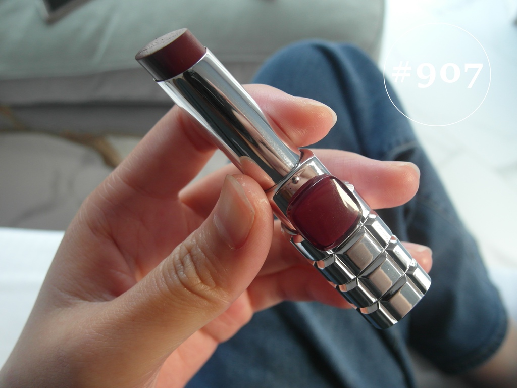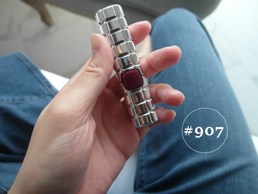 一開始我在這三色中猶豫不決,最後放入購物車的竟然是907鉚釘皮衣,因為我沒有這麼深酒紅系列的唇膏,好像可以來嘗試看看。