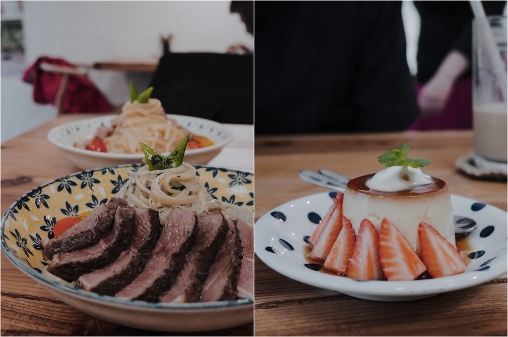 在附近住宅區晃晃等待店家開門,看見幾隻貓咪悠哉地趴臥在摩托車上,有點睡意卻又像捨不得錯過午後時光一樣。詳閱菜單本第一頁叮嚀事項後,到櫃檯點了義大利麵與一款甜點,當飯後餐點。每日甜點列在櫃檯小黑板上!味增奶油燒豬肉、黑松露蕈菇牛排、古早味布丁+草莓。